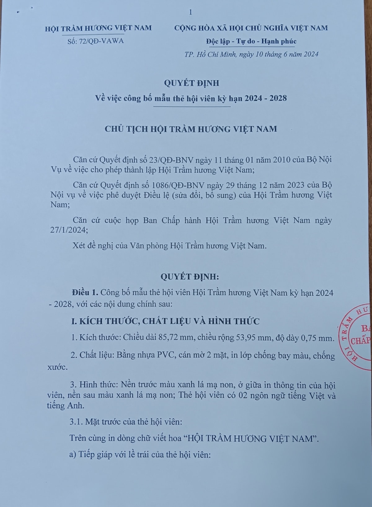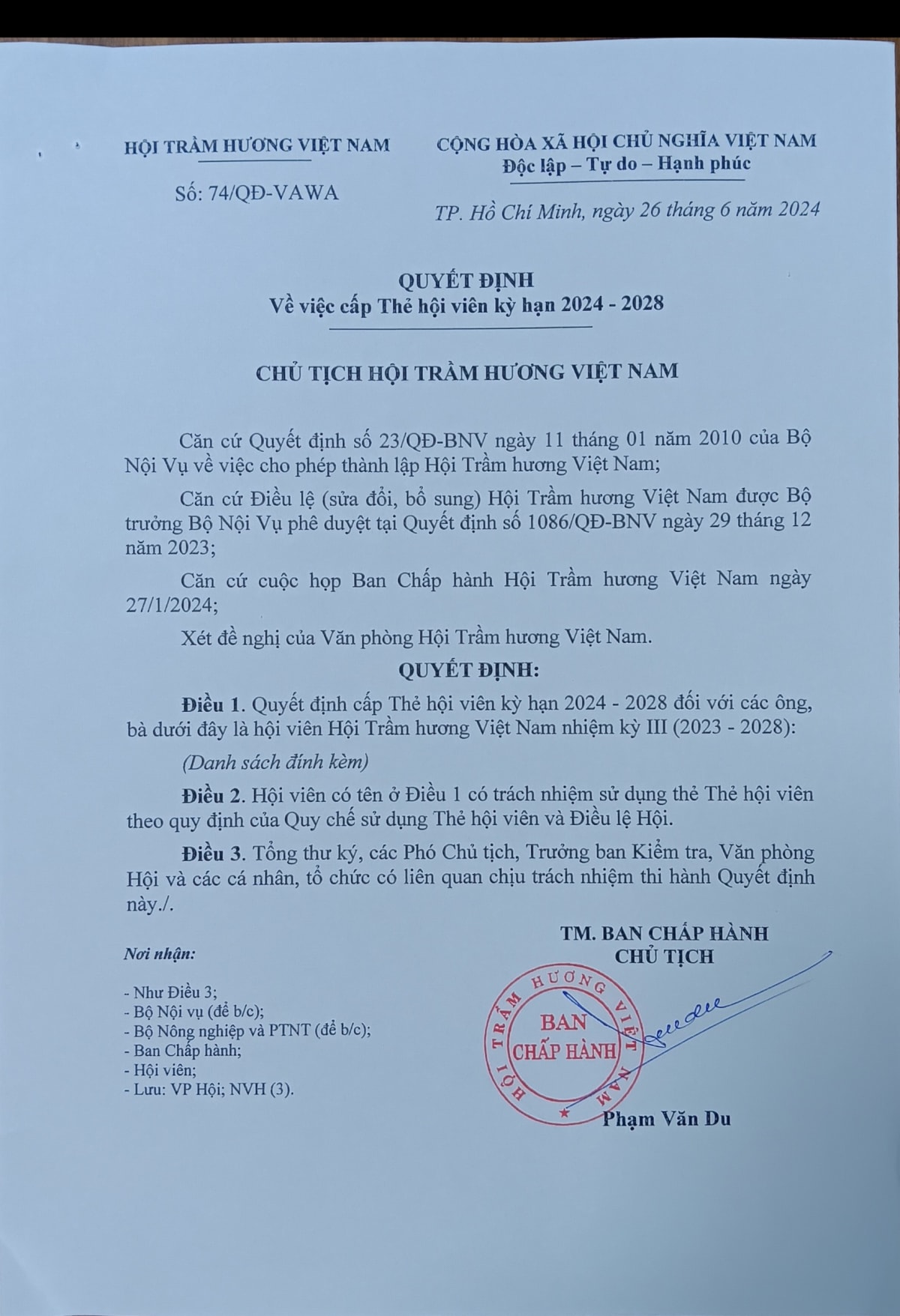 Căn cứ Quyết định số 23/QĐ-BNV ngày 11 tháng 01 năm 2010 của Bộ Nội Vụ về việc cho phép thành lập Hội Trầm hương Việt Nam; Căn cứ Điều lệ (sửa đổi, bổ sung)…