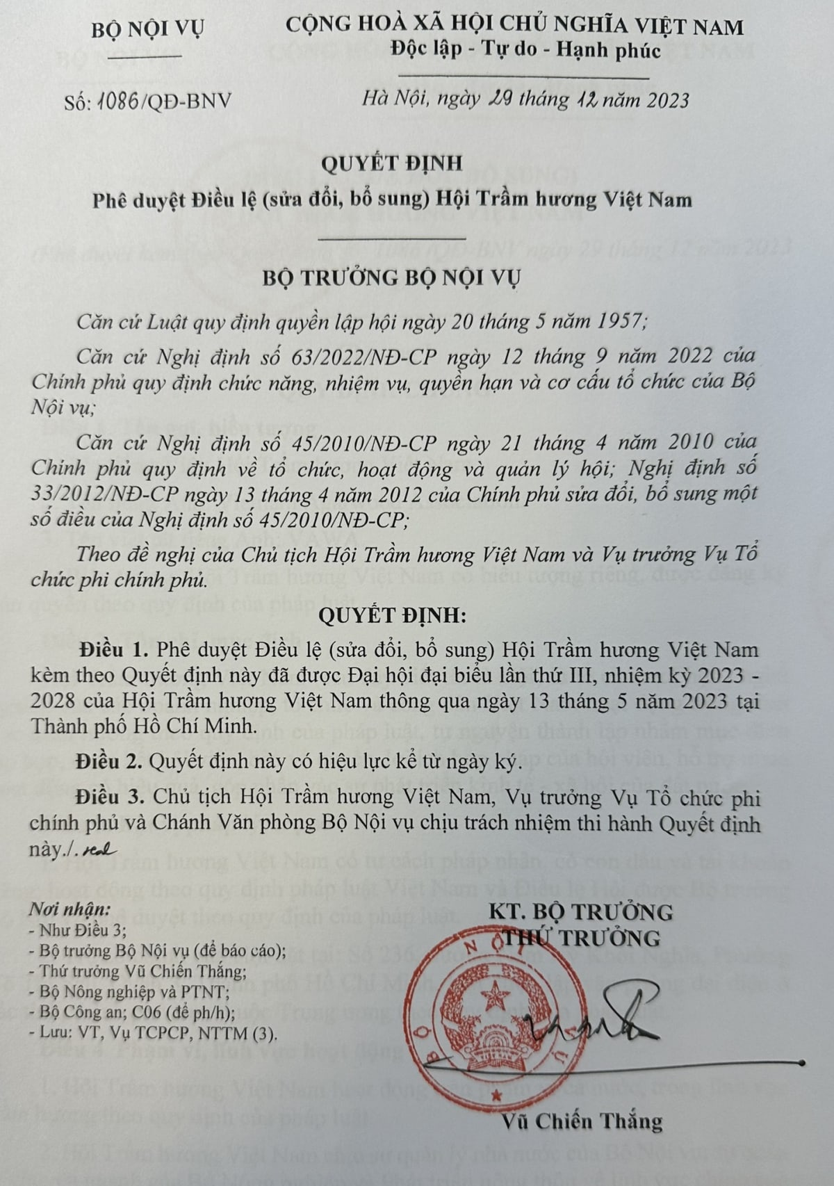 1. Ngày 29/12/2023, Bộ Nội vụ đã Phê duyệt Điều lệ (sửa đổi, bổ sung) Hội Trầm hương Việt Nam theo Quyết định số 1086/QĐ-BNV. Đây là sự thành công của Hội sau khi tổ chức Đại hội nhiệm kỳ III (2023 -2028). Điều lệ này là cơ sở pháp lý để Hội ban hành các Quy chế, Quyết định, Quy định của Hội.