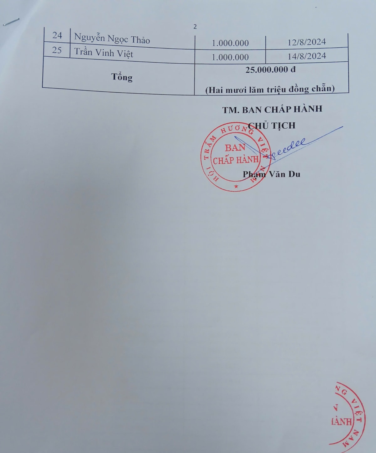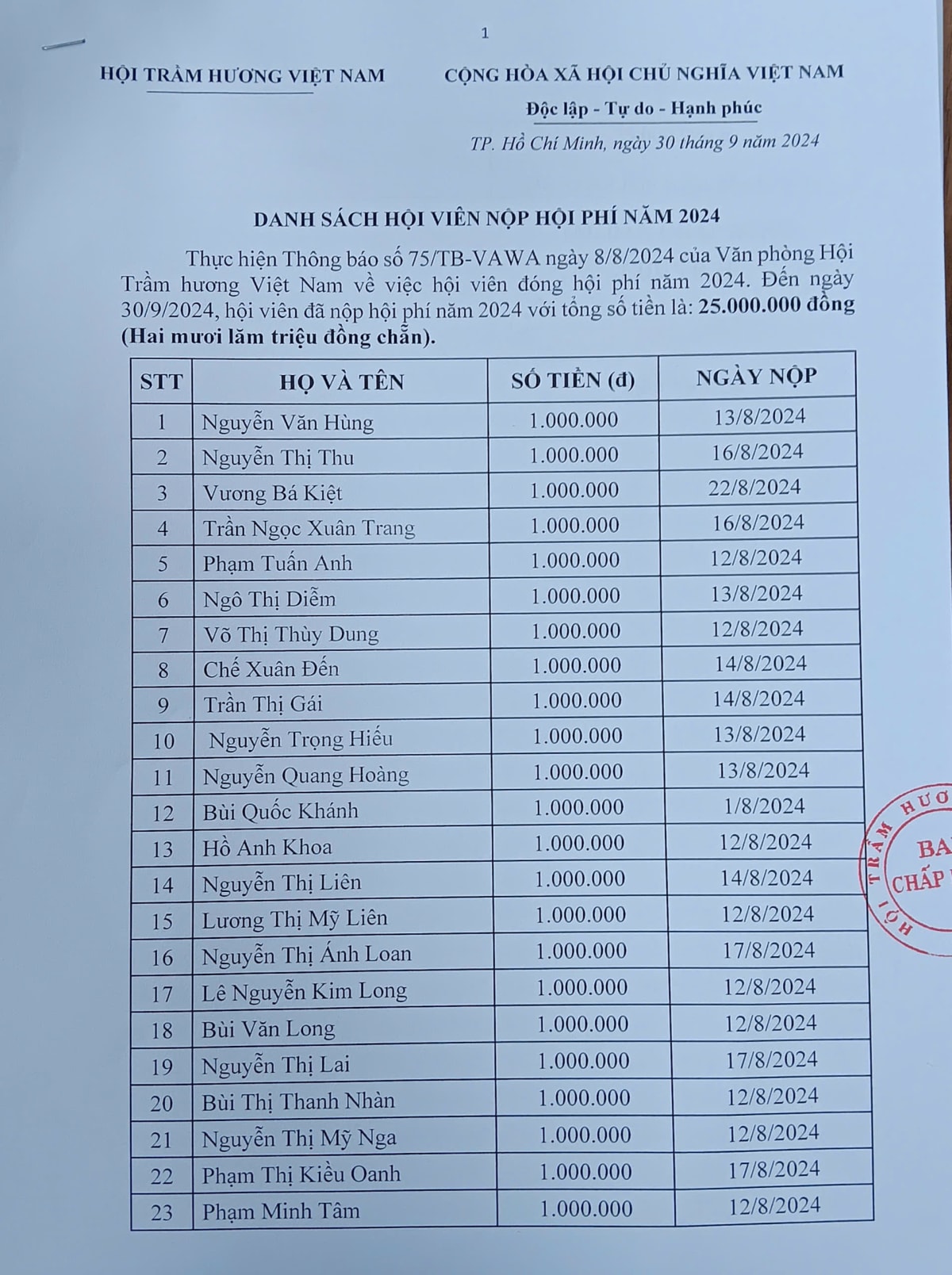 Thông báo danh sách hội viên nộp quỹ hội năm 2024