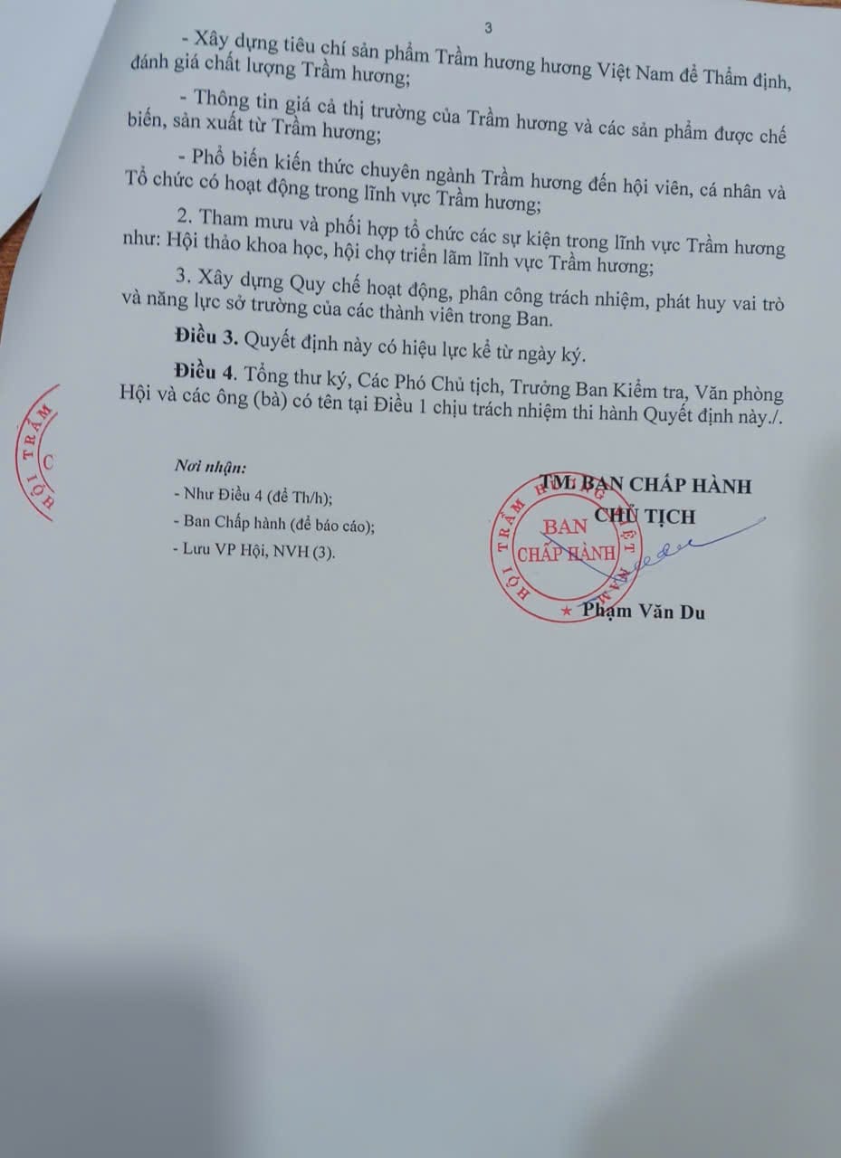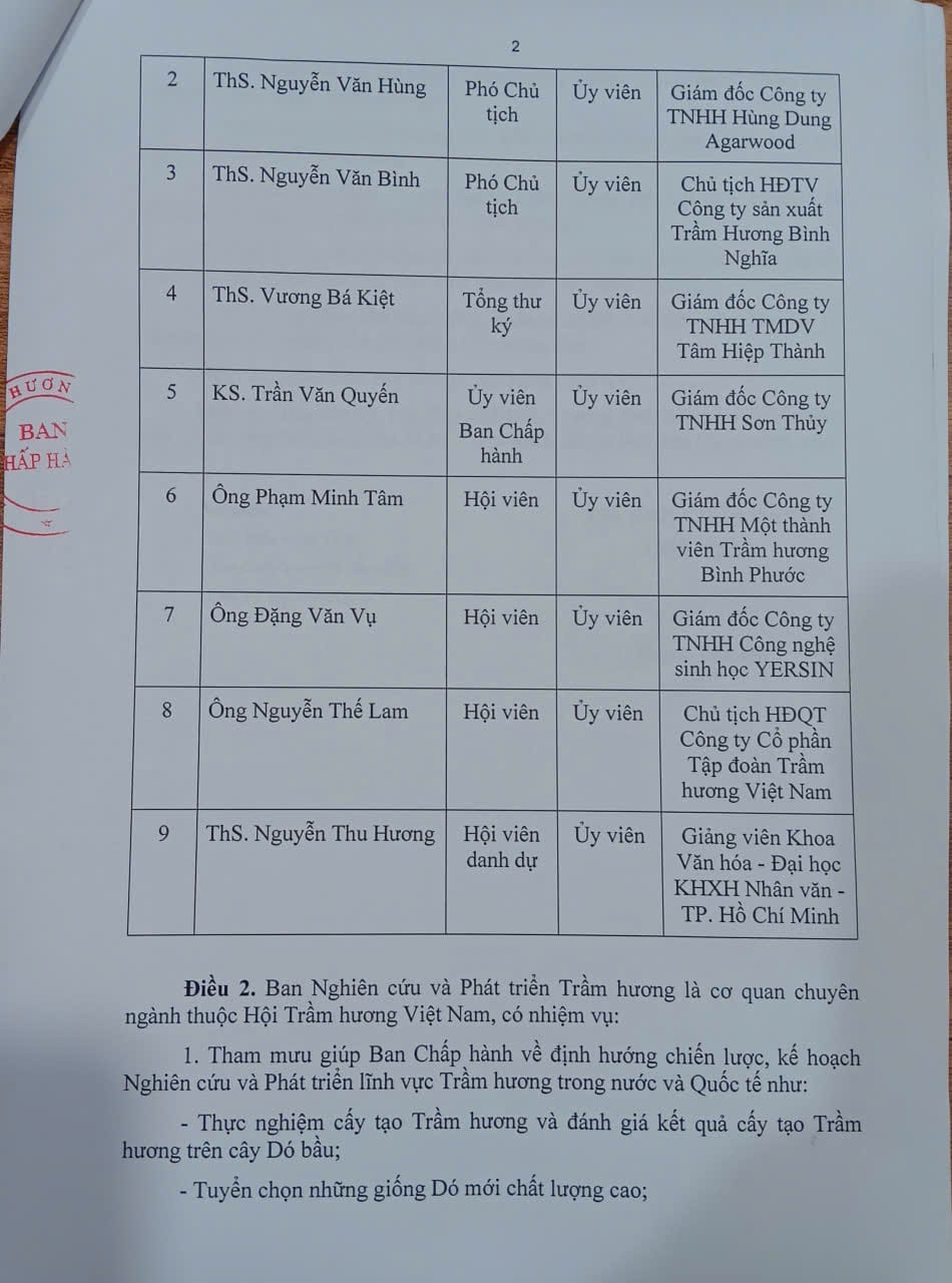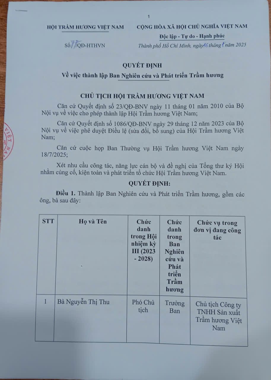 Ngày 16 tháng 8 năm 2025, Chủ tịch Hội Trầm hương Việt Nam ký ban hành Quyết định số 77/QĐ-HTHVN, về việc Thành lập Ban Nghiên cứu và Phát triển Trầm hương trực thuộc Hội. Ban Nghiên cứu và Phát triển Trầm hương do Bà Nguyễn Thị Thu, Phó Chủ tịch Hội làm Trưởng ban, cùng các thành viên là các chuyên gia, doanh nhân và giảng viên uy tín trong lĩnh vực Trầm hương.