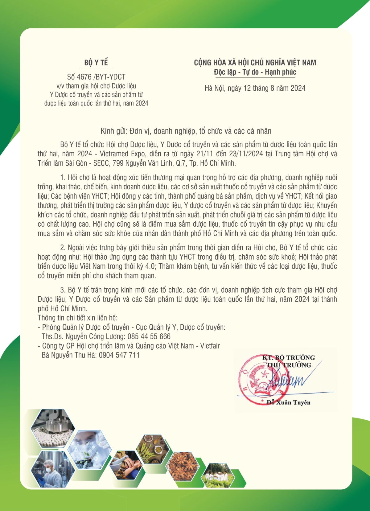 Kính gửi: Ban Chấp hành và toàn thể hội viên Hội Trầm hương Việt Nam. Bộ Y tế tổ chức Hội chợ Dược liệu, Y Dược cổ truyền và các sản phẩm từ dược liệu toàn quốc lần thứ hai, năm 2024 - Vietramed Expo diễn ra từ ngày 21/11/2024 đến 23/11/2024 tại Trung tâm Hội chợ và triển làm Sài Gòn - SECC - 799, Nguyễn Văn Linh, Quận 7, Thành phố Hồ Chí Minh (Công văn đính kèm).